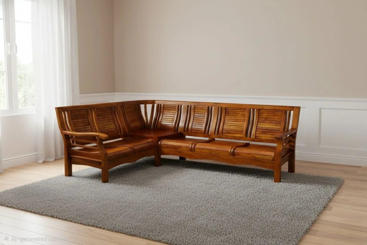 The Sanjana Corner 5 Seater Teak Wood Corner Sofa is designed to combine the durability of solid teak wood with comfortable and space-efficient seating. Its corner configuration maximises seating capacity while maintaining an open and inviting layout, making it ideal for family living spaces and social gatherings. The solid teak wood structure ensures long-lasting strength, while cushioned seating provides everyday comfort without compromising the natural elegance of the wood.